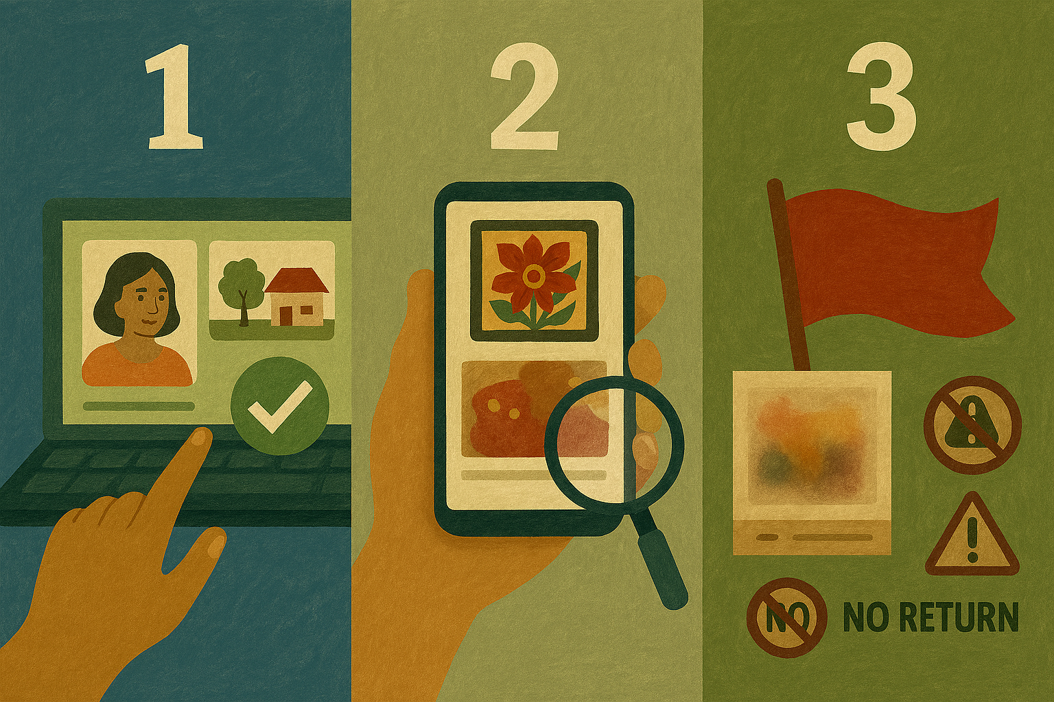 - Step 3: Watch for red flags such as fuzzy origins, no-return clauses, sales pressure, or borrowed images when you buy modern art online.
