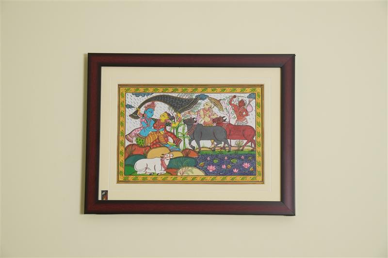 This Patta Chitra masterpiece depicts Radha and Krishna’s rasa lila, featuring clear indigo threads that represent the monsoon. The painting celebrates divine love, the rich heritage of Odisha, and pastoral beauty through unique and rare brushstrokes.