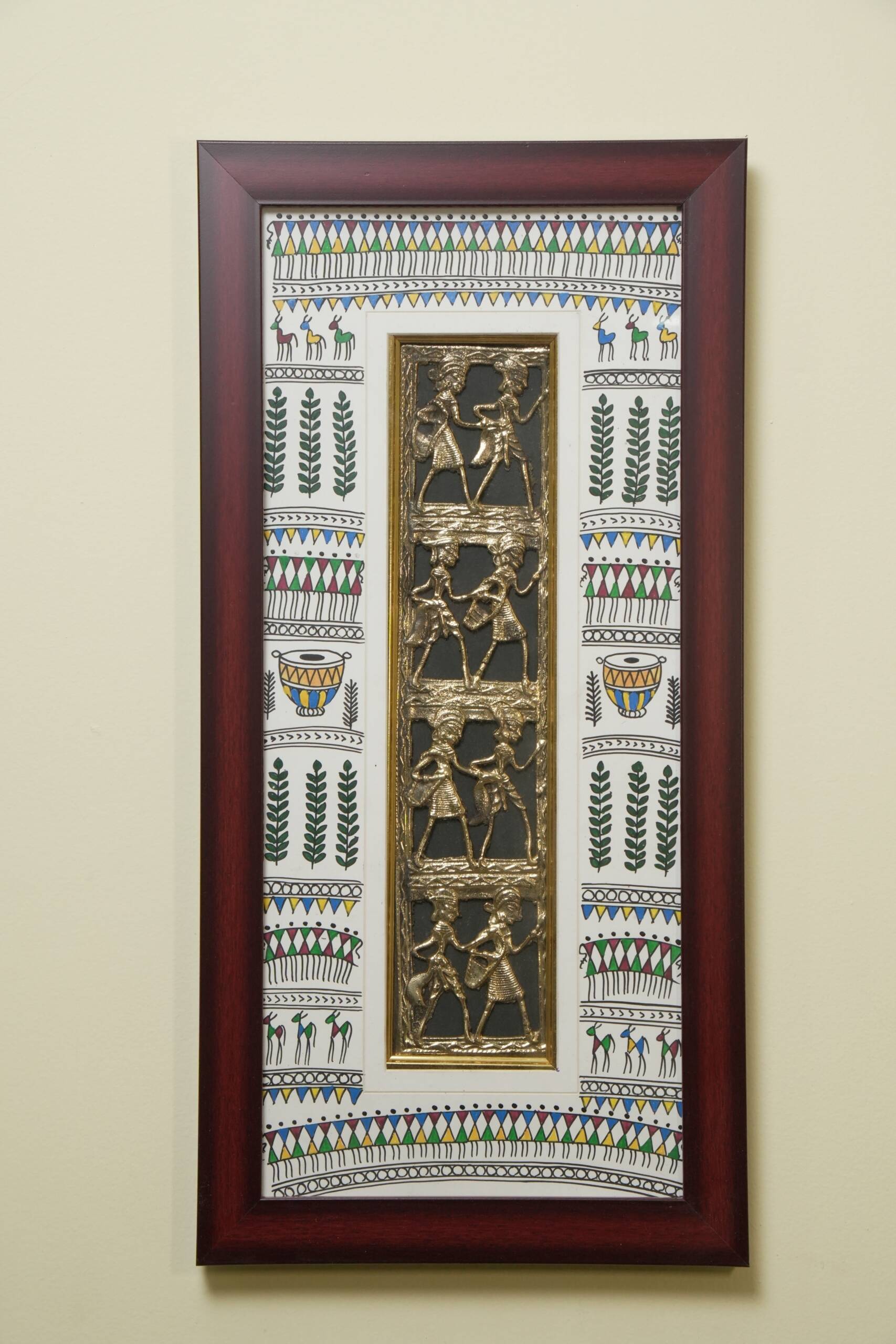 This handcrafted Dokra brass panel features tribal dancers in rhythmic motion, set within a beautifully painted frame inspired by folk art. Made using the traditional lost-wax casting method, it blends metallic elegance with vivid patterns. Ideal for living rooms or offices, it’s a unique fusion of art and culture.