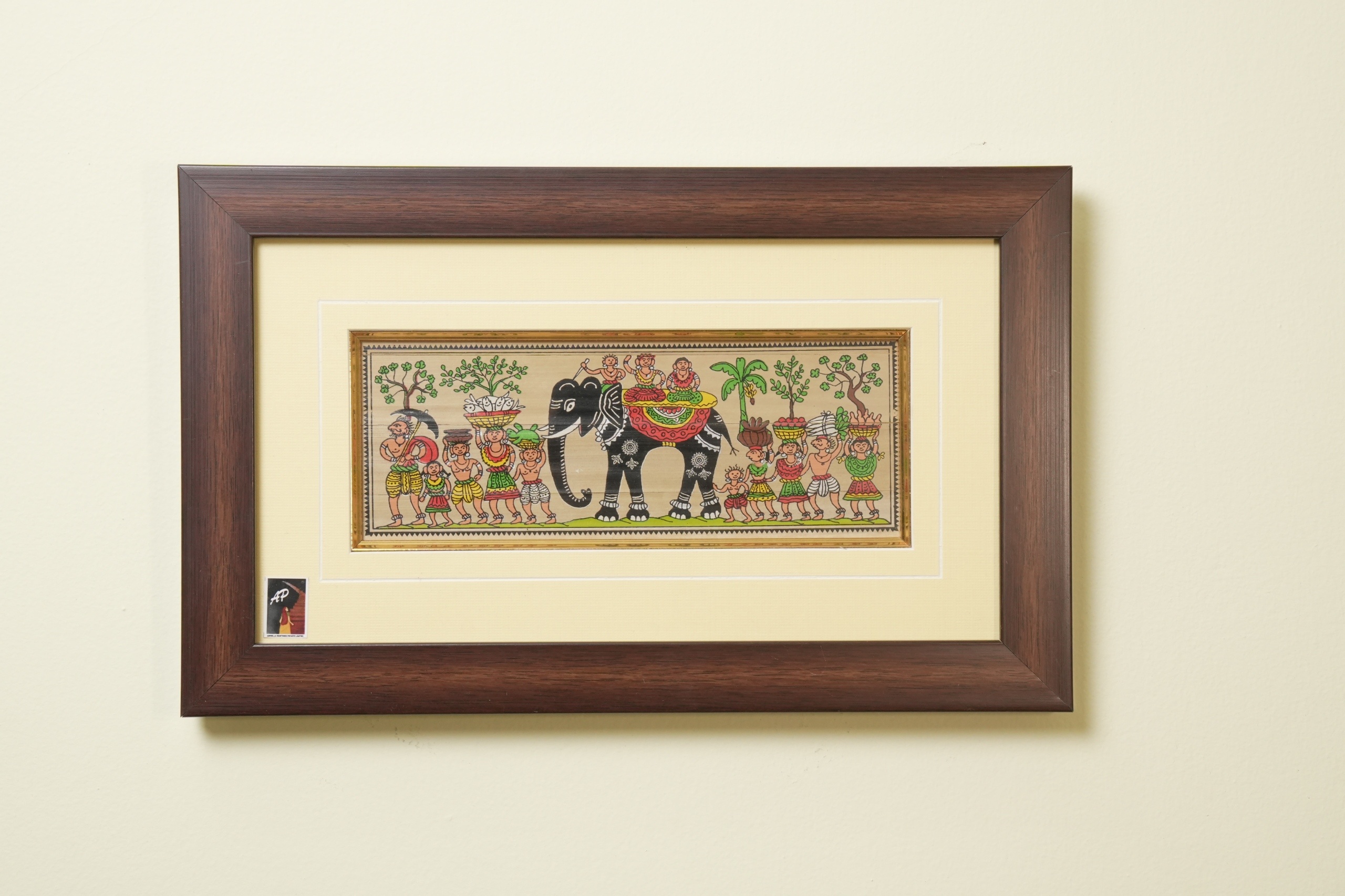 The tribal art is a depiction of villagers accompanying a decorated elephant which was a common tribal tradition, extinct now. The rich details and use of rich colors add to the exotic tribal fervor that you expect from the rare art forms and canvases. Buy this exclusive piece now!