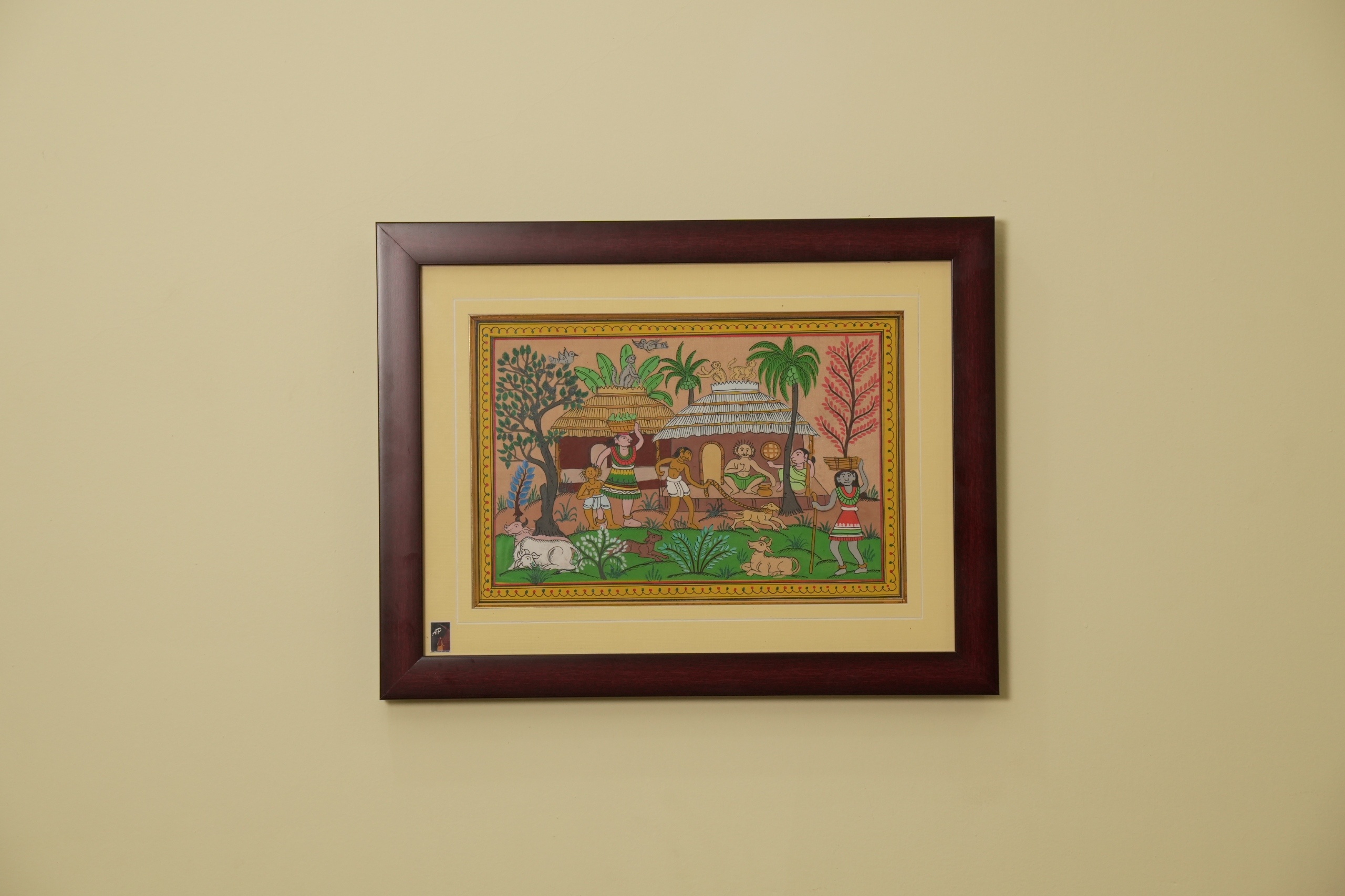 This talpatra-based hand-painted artwork captures the tribal courtyard scenes. The dominant print includes animals, people in motion, earthy tones against a warm backdrop. Every detail is etched by hand, every color steeped in tradition. It’s not just décor, it’s a slice of rural life. Perfect for homes that value heritage and craft.